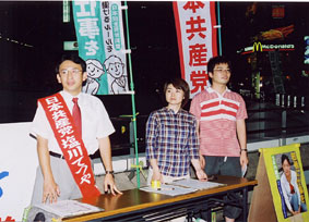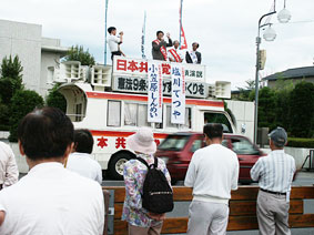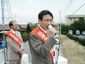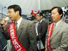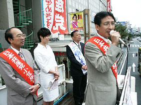 | ■群馬県で衆院北関東ブロック・キャラバン宣伝の弁士に (9月6日) 日本共産党の躍進をめざす衆院北関東ブロック・キャラバン宣伝が6日から始まりました。塩川衆院議員は6日、50人が集まった高崎市高島屋前で小笠原しんめい北関東ブロック比例候補と演説。塩川議員は、憲法をふみにじって自衛隊をイラクに派遣しようとしているなど、小泉政権の異常なアメリカ追随ぶりを批判。経済の問題でも大企業の社会的責任を果たさせることが重要として、くらし・福祉優先の政治への転換を呼びかけました。