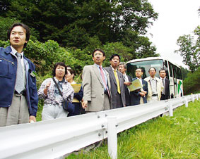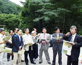 | ■八ツ場ダムなど視察、住民と懇談 (9月8日) 「脱ダムの流れを群馬でも」と、日本共産党の塩川衆院議員、大門参院議員、小笠原衆院比例候補らは8日、群馬県長野原町の八ツ場ダム、倉渕ダム、増田川ダム予定地を視察しました。計画から51年目となる八ツ場ダム予定地では、水没する川原湯温泉街の住民と懇談。代替地がないために、助成金をもらって地区外へ出て行く人が増えている現状や「国は私たちの苦しみをわかってくれない」などの不満が出されました。イヌワシ保護のために工事を中断していたいもかかわらず防災に名をかりて橋脚工事まですすめている県の倉渕ダムと松井田町に計画されている増田川ダム予定地も視察しました。参加者は「地元住民の苦悩と自民党政治の冷たさを目のあたりにした」「巨大なむだ遣いと自然破壊をなんとしてもやめさせたい」と感想を話していました。
