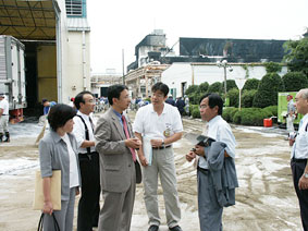 | ■栃木県黒磯市・ブリヂストン大火災で現地調査(9月10日) 栃木県黒磯市のブリヂストン栃木工場大の火災で、日本共産党の塩川衆院議員らが、10日の午後工場内で火災の原因や背景などを調査し、近隣住民からの要望などを聴取しました。塩川議員に、本橋伊作工場長は「大惨事をおこし、近隣住民にご迷惑をかけました」とのべ、火災事故や工場の操業状況などを説明しました。火災を起こしたゴム練り施設は、29年前に建設。出火したのは8台ある同装置の1台で、2004年に更新を予定していたことがわかりました。本橋工場長は「発見者がダクトから火柱があがっていたことから、ダクトから約7b離れたモーターの加熱とは考えにくい。可燃物の薬剤がたくさんあったのが問題だった」と語りました。野積み状態のタイヤ製品に延焼した問題では、同工場側は「冬場のピークに備えて在庫をためていたため」と説明。安全より生産優先の姿勢が浮き彫りになりました。現地調査に参加した日本共産党の野村節子栃木県委員会ブリヂストン火災対策本部長らは、住民への被害補償や事故原因の究明と公表、従業員への仕事・生活保障を要請しました。