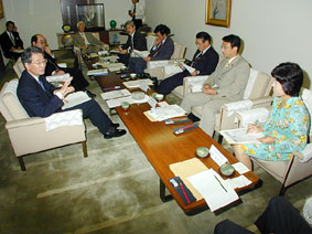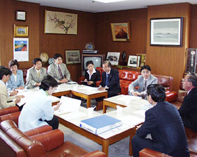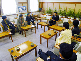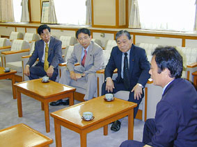 | ■上田埼玉県知事と懇談 (9月11日) 埼玉県の日本共産党国会議員団は11日、県庁に上田清司知事を表敬訪問、初の懇談をしました。矢島衆院議員、塩川衆院議員、富樫参院議員、大門参院議員、あべ前参院議員、山岸県議団長が参加しました。矢島議員は「日本共産党は高原県知事候補がかかげた土屋疑惑の徹底解明、ムダな大型公共事業の見直しなどの公約実現に全力をあげるので、知事も公約で示した県民のためになる施策実現のためにがんばってほしい」とのべました。 塩川衆院議員は県北の本庄拠点都市計画など大型開発の見直しや後継者問題を含めた中小企業対策を要請。大門参院議員は、りそな銀行の独立問題について尋ねました。 上田知事は、越生町の「桜の郷」構想の名称変更と計画の見直しをはじめ、大型開発は個別の委員会をつくり検討し、サッカースタジアムなど既存施設の徹底した活用法を考えていることを明らかにし、「議員や県民のみなさんの積極的な提案をいただきたい」と語りました。