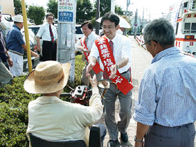 | ■衆院埼玉八区内で街頭から訴え (9月7日) 塩川衆院議員は7日、埼玉県大井町サティ前と三芳町マミーマート前で街頭宣伝をおこないました。続いて日本共産党所沢旧町東支部の党員、後援会員と一緒に路地裏や商店街、大通りをビラを配布しながらハンドマイクで訴えました。塩川議員は、先の知事選で「民主県政をめざす会」の高原みさ子さんが訴えた土屋ファミリーやくらしを大事にする政治への転換が県民の共感を呼び、新知事が「本庄拠点都市」計画の見直しを言うなど、現実政治に影響を与えていると紹介。国の政治でももうけ第一でなく、働く人を守る雇用制度や社会保障の確立など「くらしを足元から守るために力をあわせましょう」とよびかけ、参院埼玉補欠選挙と衆院選への支援を訴えました。 |