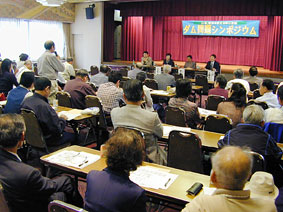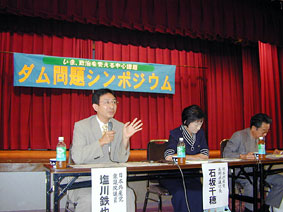| ■群馬県ダム問題シンポジウムでパネラーに (9月23日) 日本共産党群馬県委員会主催の「ダム問題シンポジウム」が23日、前橋市の県女性会館で開かれました。パネリストとして塩川てつや衆院議員、「八ツ場ダムを考える会」代表の樽谷修・東京理科大学教授、石坂千穂・日本共産党長野県議団長の3人が発言。日本共産党の伊藤裕司群馬県議が司会しました。 塩川議員は、来年度の概算要求でダム関連予算が9%も増えるなど小泉内閣の大型公共事業偏重ぶりを批判。゛脱ダム゛にむけた全国的な取り組みを報告し、「群馬でのたたかいが下流都県の運動を励ますことになる。力を合わせて頑張りましょう」と訴えました。 会場からは「ダムと海岸線の後退との関係は」「水利権の問題はどうなる」「内水面漁業への影響は」などの質問が出され、活発な討論がおこなわれました。