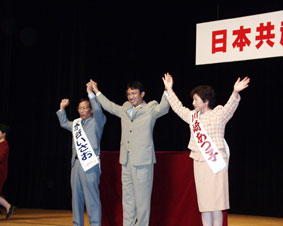 | ■ひたちなか市演説会で弁士に (9月24日) 総選挙と市議選(10月19日告示・26日投票)での勝利を期して、日本共産党演説会がひたちなか市内で24日に開かれ、約160人が参加しました。市議予定候補の水谷いさお氏と川崎あつ子衆院4区予定候補が決意表明をおこないました。 塩川衆院議員は、小泉政治を変える日本共産党の3つの緊急提案、@仕事や雇用の確保A社会保障の改悪中止B消費税大増税阻止−を紹介。細川連立政権の経験にふれながら、「政権交代だけでは日本は変わらない。政治は日本共産党が伸びてこそ変えられる」と力説し、総選挙と市議選の勝利を呼びかけました。