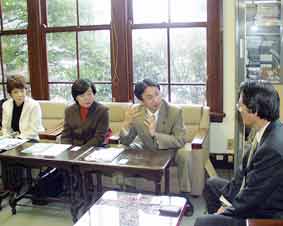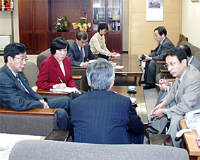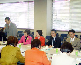 | ■郵政産業労働組合中央本部役員と懇談(12月10日) 郵政産業労働組合(郵産労)中央本部役員のみなさんと党国会議員団との懇談に出席。今年4月に発足した郵政公社後の職場の状況、郵政民営化議論の現状などについて意見交換しました。 |