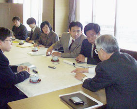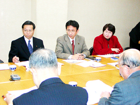 | ■足利銀行問題で調査(12月3日) 塩川てつや衆院議員は3日、大門みきし参院議員らとともに足利銀行の一時国有化問題調査のため、同行本店のある宇都宮市を訪問しました。 一行は栃木県庁、足利銀本店、県商工会議所連合会幹部と懇談。商店街や業者らへの影響を調査しました。 県庁では「まさしく突然だった」と驚きを隠せない鈴木勲総務部長と懇談。部長は「地元経済・企業のことが考慮されたのか心配だ」と述べ、一時国有化という処理方法に疑念を示しました。 足利銀本店で応対したあしぎんフィナンシャルグループの田村秀一常務取締役は、債務超過となる監査報告を監査法人から突然示された経過を説明。「もう少し時間を与えていただければ…」と悔しさを隠し切れない様子。無価値になった同行の株を持つ地元業者らの問題では「投資ではなく足銀頑張れと(いう趣旨で)持っていた人が多い。東京でしゃくし定規に考えるのとは違う」と語りました。 県商工会議所連合会の簗郁夫会長は懇談で、地元経済に対する考慮に欠けた今回の措置を「血も涙もないやり方だ」と批判し、県内経済界に懸念が広がっでいる実情を紹介しました。
