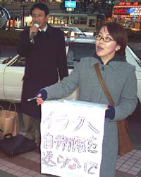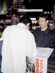 | ■イラク派兵の基本計画決定で「計画中止を」と宣伝(12月9日) 小泉内閣は9日、イラクへ自衛隊を派兵する「基本計画」を決めました。 それを受け塩川てつや衆院議員は9日夕、埼玉県所沢市の西武所沢駅西口で市議団や党支部の人たちとともに自衛隊のイラク派兵に反対する署名・宣伝をおこないました。塩川氏が「憲法前文をわい曲して自衛隊のイラク派兵を合理化する小泉首相と日本政府に怒りの署名を」と訴え、高校生やお年寄りらが次々に足を止め協力しました。