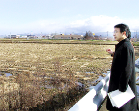 | ■超大型店・街づくり問題で調査(12月18日) 塩川衆院議員は18日、福島県を訪れ、ジャスコが計画する超大型店の出店予定地(26万u)、伊達町の現地を視察しました。広大な田圃とリンゴの木がひろがる農業地域を前に、数年にわたって大型店の出店を阻止してきた「県北地域の大型店出店とまちづくりを考える会」の事務局の方から説明を受けました。その後、県庁で「広域まちづくり検討会」についても聴き取り調査をおこないました。