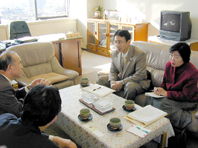 | ■足銀破たんで栃木県信用保証協会などと懇談 (2003年12月26日) 足利銀行の破たん・国有化問題で塩川鉄也衆院議員と野村せつ子栃木県副委員長は26日、県信用保証協会、県中小企業再生支援協試会を訪ね、実情を聞くなどして懇談しました。 足銀破たん後、県保証協会への融資の申し込みは千九百四件。昨年同月比(25日現在)で件数1・5倍、金額では3倍にはね上がっています。斎藤哲専務理事は、日本共産党の中小企業のセーフティーネットづくりの努力に謝辞を表明。「破たんの影響から三月決算で相当の赤字企業がでるのでは」と県内経済に悪影響が広がるとの見方を示しました。 県再生支援協議会で、これまでに受けつけた相談は83件。その約7割が「金が回らないなどの資金繰り」をめぐる資本金一千万円未満の企業からのものです。応対した幹部は「整理回収機構に送られる前に、企業の再生を図るのがわれわれの仕事。足銀の『受け皿さがし』を急ぐ動きがあるが延期するために力を貸してほしい」と塩川議員に協力を要請しました。 塩川議員は「再生支援中に『受け皿』が決まると、企業再生に混乱が生じる。再生が機能的にすすめられるよう努力したい」と答えました。
