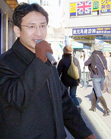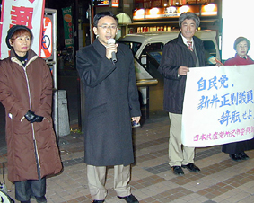 | ■「買収容疑の新井議員は辞職せよ」と街頭宣伝 (12月29日) 買収容疑で自民党の新井正則衆院議員(埼玉8区選出)が逮捕された問題で、塩川鉄也衆院議員は29日夕、所沢市内で柳下礼子前県議、所沢市議団とともに街頭宣伝に立ち、「新井議員はただちに辞職を。今こそ政党助成金を見直しキッパリ廃止を」と訴えました。 塩川議員は「自民党に金権政治を改める能力がないことがまた明らかになった」とのべ、選挙中、新井氏を熱心に応援した小泉純一郎首相の政治的道義的責任を強調。税金でまかなわれている政党助成金を買収資金に使った新井氏を厳しく糾弾した塩川議員は、1月から始まる通常国会でこの問題を追及していく決意をのべました。