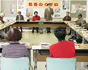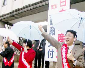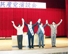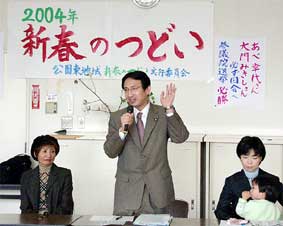 | ■栃木・都賀町議選の演説会で訴え (2月1日) 2月10日告示の栃木県都賀町議選に向けた演説会が1日、都賀町ハートホールでおこなわれ、塩川議員が、イラク派兵の強行、医療・福祉・年金の改悪など社会保障の国民負担増、消費税増税を狙う小泉内閣を批判、町議選やこの夏の参院選での躍進を訴えました。