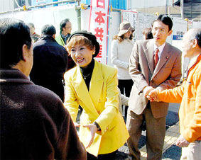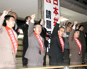 | ■東京地評などの国会請願デモを激励 (2月4日) 東京地方労働組合評議会(東京地評)などのイラク派兵反対・年金改悪阻止の国会請願デモを激励しました。 |