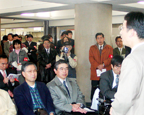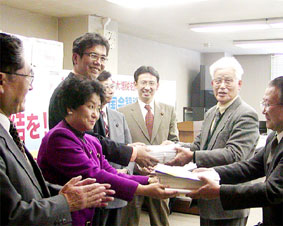 | ■年金改悪反対、派兵撤退の国会要請で署名を受け激励 (2月25日) 中央社保協、国民運動実行委員会、安保破棄中央実行委員会、「有事法制は許さない!運動推進連絡センター」の呼びかけで、イラクからの自衛隊の撤退と年金改悪に反対する国会要請行動が衆院の議員面会所でおこなわれました。国会情勢を報告し国会の内外で、ともにがんばりましょうと激励しました。