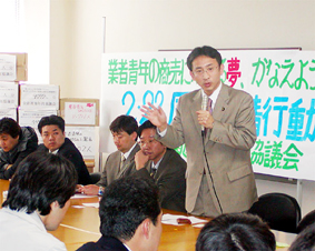 | ■全商連青年協の署名提出行動であいさつ (2月23日) 全国商工団体連合会青年部協議会(全商連青年協)が「業者青年が元気に商売をできるよう支援を」と業者青年の地位向上を求める署名約10万人分をもって国会を訪れました。全国から約30人ほどが参加。与野党の経済産業委員などに要請、私の部屋も訪れてくれました。要請後の集会には大門参院議員や吉井衆院議員とともに参加、情勢報告をして激励しました。