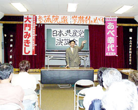 | ■茨城・東海村の演説会で訴え (6月9日) 茨城県の東海村で日本共産党茨城北部地区委員会主催の演説会が9日夜、おこなわれ、田谷たけお党県副委員長と一緒に、参院選での躍進を訴えました。 わたしは、大門参院議員が日立電鉄線存続などの問題を国会でとりあげ、無認可保育園への消費税課税問題では非課税措置への検討を約束させたことを報告。くらしを守る先頭に立つ大門参院議員の必勝をよびかけました。年金、消費税、憲法問題などでの日本共産党の値打ちを紹介しました。