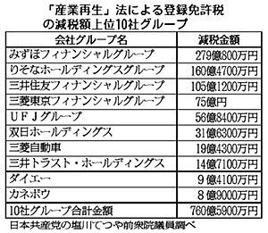 | ■10万人減らし1千億円減税/「産業再生」法で大企業――自公が成立させ民主も改悪賛成、異常なリストラ支援(8月23日「しんぶん赤旗」より) リストラすればするほど減税の恩典が与えられる「産業再生」法の適用をうけた大企業が10万人の人員削減を計画・実行し、約1千億円もの減税をされていたことが分かりました。これは、日本共産党の塩川てつや前衆院議員の調査で判明したものです。 ■塩川前議員が調査 「産業再生」法が施行されたのは1999年10月。それ以降、2005年7月末までに同法に認定された件数は372件に達します。認定された「再生」計画の人員削減数は9万9608人。会社設立や増資などの場合に課税される登録免許税の減税金額は合計で980億7500万円にのぼります。人員削減1人当たり約98万4600円の計算になります。