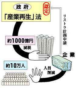 【「産業再生」法】 正式名称は、「産業活力再生特別措置法」。1999年8月に制定、10月に施行されました。リストラを予定している企業がリストラ計画を作成し国に申請します。一定の基準を満たせば国がその計画を承認し、登録免許税などの減税や金融支援などの恩典を与えます。 |