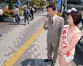 | ■埼玉・蕨市議選の告示で応援に(5月27日) 日本共産党の議席はくらしを守る力。予算組み替え提案で市を動かし、全校舎の耐震化を12年度までに実施させることに。また、署名運動の取り組みと一体になって、国保税・下水道料金の値上げストップ。市長選とともに4人の市議団実現必ず。
