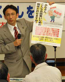 特例法案の再可決は「09年度から一般財源化」という福田首相の方針と矛盾する。閣議決定で一般財源化を担保したというが、国会の議決で成立する法律を閣議決定で担保することなどできない「暴論」だ。 福祉、医療、教育にもつかえる一般財源化こそ国民の要求だ。 |