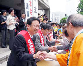 怒りの大本は、高齢者への差別医療の導入にあります。与党が見直し案を発表しましたが、法律の条文も変えず、厚労省内の仕組みを少しいじるだけ。差別医療制度の根幹を変えないままでは、国民、高齢者は納得しません。 日本共産党は法案提出時から反対しました。川崎二郎元厚労相は「当時、後期高齢者医療制度は議論にならなかった」が、「日本共産党だけはちゃんと本質を突いていた」と述べています。 国民世論に押されて、政府与党は、野党提出の後期高齢者医療制度廃止法案を廃案にできず、次期国会までの継続審議扱いとしました。ぜひとも国民世論の力で、自公に迫り、「審議拒否」中の民主党などにもしっかり働いてもらって、可決成立を迫っていこうではありませんか。 政府与党は、「社会保障」切り捨ての政治に対する国民の怒りの前に、社会保障財源として、消費税増税を口にするようになっています。 枡添厚労相は「(医療や福祉などの)社会保障はこれ以上削れない。だから消費税引上げの検討を」と発言しています。福田首相も「(消費税について)決断しなければいけない、とても大事な時期だ」と言いはじめました。 でも「福祉」を口実に導入された消費税によって、「福祉」は豊かになったのでしょうか。実際には、豊かになるどころか、「福祉」の負担は増え、受けるサービスは切り縮められてきました。 消費税導入後、国民が納めた消費税総額は188兆円にのぼります。一方、大企業などへの法人三税の減税総額は159兆円。庶民の納めた消費税は、大企業減税の穴埋めに使われてきたのが実態です。またもや「福祉」「社会保障」を口実にして、消費税増税を押し付けるのは許せません。 消費税増税によらずとも、社会保障財源を確保する道はあります。 一つは、税金のむだづかいをただすこと。例えば年間5兆円の軍事費を削減することです。「山田洋行」で問題となった防衛装備品の水増し請求は、主要な軍需企業において蔓延していました。石破防衛大臣も「防衛装備品の2割は見直しが必要だ」と述べています。それなら浮いたお金は「社会保障」に回すのかといえばそんな話は聞こえてきません。出てくるのは「米軍再編経費に充てる」という話。米軍基地強化のために3兆円も日本国民の税金を投入し、そのうちの7千億円は、米国領土のグアムに米海兵隊の基地を建設するために使うとのこと。外国領土に外国軍基地をつくるのに、なぜ日本国民が税金の負担をしなければいけないのか。全く筋が通りません。 政府は、米軍に毎年「思いやり予算」を2千億円超支出しながら、社会保障費の伸びを毎年2200億円ずつ削ってきました。これは「思いやる」相手が間違っているのではありませんか。 第二に、ゆきすぎた大企業・大資産家減税を見直すときです。税制について国が行ってきたことは何か。非正規雇用が拡大して国民全体の所得は減少しているのに、定率減税の全廃などの庶民増税を押し付ける。一方、過去最高の収益を更新してきた大企業には、その企業減税を継続する。やることが全く逆立ちしています。中小企業の税制はそのままでも、大企業への減税を10年前の水準に戻せば、4兆円の財源を生み出せます。 よく「大企業減税を見直すと国際競争に勝てない」といいますが、過去5年間の大企業の儲けはいったい誰に配分されたのか。過去5年間で大企業の収益は2倍に増加しています。その間、大企業の労働者の賃金は逆に1.4兆円も減少しました。非正規雇用が拡大したからです。大企業の利益が地域社会に還元されたわけでもありません。増えたのは役員報酬と株式配当です。大企業の役員報酬はこの5年間で2倍に増加し、大株主などへの配当は4倍に増加しています。 「国際競争力」などといって大企業減税の恩恵にあずかったのは、身内の人間ばかり。大企業・大資産家に応分の税の負担を求めることが、納得のいく解決策ではないでしょうか。 税金の使い方、税金の集め方を見直して、社会保障を予算の主役にすえる。大企業中心の経済政策から国民の暮らし・家計を軸にした経済政策に転換をめざすのが日本共産党です。 私は、消費税増税に断固反対を貫きます。福田首相は「国民世論がどう反応するか一生懸命みている」と述べました。それならやることは明確です。福田自公政権に、消費税増税ノーの声を突きつけようではありませんか。 |