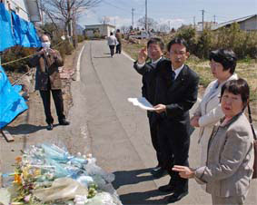 高橋ちづ子衆院議員、酒井宏明衆院北関東比例予定候補と角田喜和、加藤幸子両渋川市議らとともに、入所者10人が死亡した群馬県渋川市の「静養ホームたまゆら」の火災事故調査で県庁、市役所などを訪れた。 29日夜、火災現場近くに住む後藤一さん宅で、後藤さんや介護施設の改善提案などをしているNPO法人「ハートランド」の岸治彦さんと懇談。後藤さんらは以前から入所者への対応や施設の管理などについて疑問を持ち、関係自治体に知らせていたにもかかわらず対応しなかったとして「事故は行政の不作為で起きたもの」だと話していた。 30日朝、火災現場を訪れ献花し犠牲になった人たちを追悼。市役所と渋川広域消防本部、県庁で担当者から事故の概要と対応などについて聞き取りをした。 渋川市の吉原康之副市長は「介護や医療制度のはざまで起きた問題。国の制度そのものを改善する必要がある」と話した。 なぜ事故が起きたか、今後どう改善するか、国会でも国や県の責任を明らかにしていきたい。