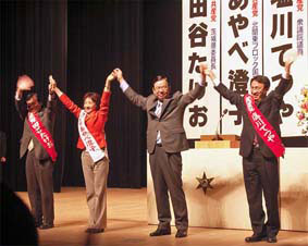 | ■群馬/藤岡市で演説会(4月26日) 井上さとし参議院議員・党参院国会対策委員長が訴えた。政府の補正予算案について「入り口はバラマキ、出口は消費税の大増税、こんなことでどうして景気が良くなるのか。今必要なのは国民の暮らしを直接暖める政治に切り替えることだ」と力説した。私は「安定雇用の確保と社会保障削減路線の転換で国民生活を守ることが政治の仕事」と強調した。 日本共産党も参加する「八ツ場ダムを考える一都五県議会議員の会」代表の関口茂樹県議(元鬼石町長)から「命と暮らしを守るために最大の努力を惜しまない日本共産党の活動に心から敬意を表します」とのメッセージが寄せられた。