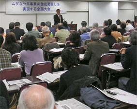 集会では、圏央道建設による東京・高尾山の自然破壊、ダム問題や旧大規模林道、東京と大阪を結ぶリニア中央新幹線、淀川水系の大戸川ダムの問題などに取り組む参加者が活動報告。 民主、社民、新党日本の国会議員とともに参加した。スミ塗りで隠した学者による国土交通省の八ツ場ダムの環境保全策をおこなっていた問題など、事業ありきの工事の合理化とお墨付きを改めさせ、公共事業の情報公開を前進させよう。 |