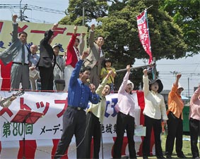快晴の青空の下、たくさんの参加者で盛り上がった。一緒に参加した保育園の娘は、肩を組んで労働歌を歌うのがおもしろかったのか、壇上に上ってきて肩を並べて、はしゃいでいた。 |