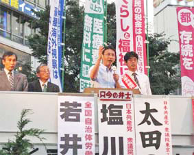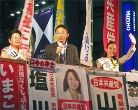 悪政を競う与党と民主を批判。暮らしと権利を守る「ルールある経済社会」、世界とアジアの平和に貢献する「自主・自立の平和外交」に転換を訴えた。 |