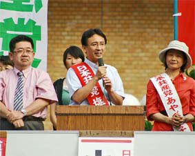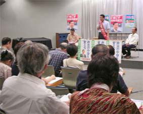 候補者は、自動車修理の自営業の家庭に育ち、大企業の製造現場で働いてきた。職場での不当解雇など体験し、まじめに働く人が報われる社会をと日本共産党に入党。いま働く人がもののように使い捨てにされるときに、雇用のルールを守れとがんばる候補者をぜひ都議会へ。 日本共産党は、派遣法抜本改正のへと政治の流れを変える原動力だ。 都議会では民主も与党。99.3%の議案に賛成。今度の都議選は、自公民「オール与党」と共産党の対決だ。 民主党は、新銀行東京を「史上最悪の失策」と批判しているが、4年前の新銀行設立のときに「夢とロマンのもてる新銀行」ともてはやしたのが民主党ではないか。与党なのに、「野党ポーズ」は都民を欺くもの。 都政を変えたいと願う人はこぞって日本共産党の候補者へ。 |