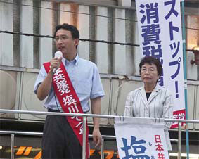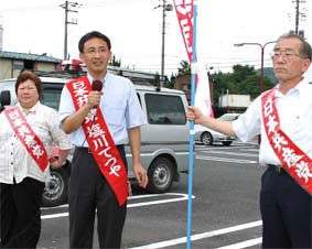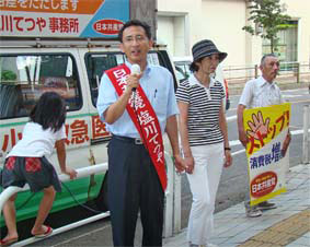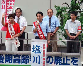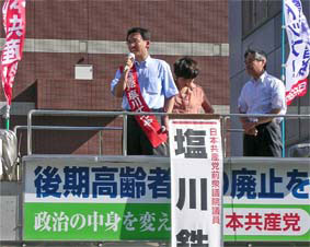 | ■いまこそ日本共産党へ(7月9日) 続発する「政治とカネ」の問題。民主党の小沢前代表、自民党の二階経産大臣などのかかわる西松建設違法献金問題、先物取引業界からの与謝野財務大臣への迂回献金問題、そして「故人から個人献金」という鳩山民主代表の虚偽献金疑惑。二大政党による「疑惑」の競い合いは、もうごめんです。 国民、有権者はゆきづまった政治を変える「ビジョン」を求めています。自民党に「ビジョン」がないことは、バラマキに終始した政府予算を見れば明らかです。 民主党は、「政権交代」による「官僚主導政治打破」といいますが、「大企業中心政治打破」とは言いません。これでは財界が発信源である消費税増税にストップをかけることも、雇用破壊を生んだ労働者派遣法を抜本改正することもできません。 企業団体献金も政党助成金も受け取らない日本共産党だからこそ「国民が主人公」の政治をまっすぐ貫けます。 日本共産党は自民党政治を転換する二つの「ビジョン」を有権者に示し、実行します。 第一は、財界、大企業の横暴から国民の暮らしを守るルールの確立をはかること。 第二は、軍事同盟絶対の政治から抜け出して、9条を生かした「自主自立の平和外交」に転換すること。 日本共産党、塩川てつやは、全力でがんばります。 |