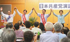 自民党中心の政治を終わらせるためには、自民党政治の悪政に一貫して正面から対決してきた日本共産党を伸ばすことが一番。政権が変わっても自民党と同じような政治の中身が続くようでは、何のために政権交代したか分からなくなる。自公政権退場の決定的審判をくだすため日本共産党を伸ばし、悪政の防波堤となる力を与えてほしい。 自民党中心の政治をおおもとから変える結果をともにつくりだそう。 |