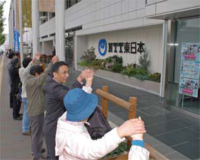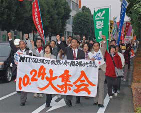 NTTの11万人リストラ反対と群馬県内争議の全面解決をめざす「10・24大集会」が、高崎市で開かれた。約300人のが参加者と一緒に、NTT東日本群馬支店を人間の鎖で包囲し「雇用破壊の元凶NTT11万人リストラやめろ」と唱和。市内中心部をデモ行進。 |