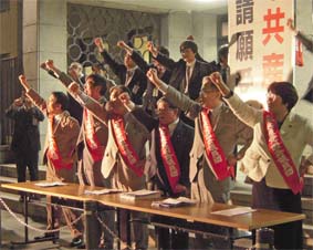 米軍普天間基地の無条件撤去を求める集会参加者を激励。沖縄県民と心一つにがんばろうという決意が伝わる意気高い集会とデモだった。 | ||