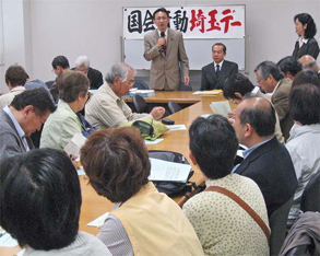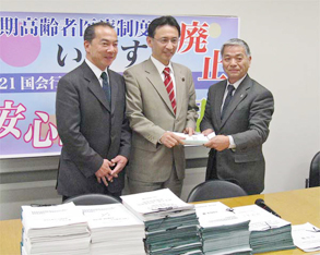 二つの会場にたくさんの参加者。伊藤岳参院埼玉選挙区予定候補といっしょに後期高齢者医療制度署名を受け取った。 | ||