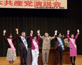民主党政権は雇用、後期高齢者医療制度、消費税増税、沖縄問題など、どれもマニフェストの中身を投げ捨て、自民党政治に後戻りしている。大企業には法人税減税、ムダな公共事業はそのまま。アメリカいいなり、大企業優遇の政治を変え、国民のくらしをまもる近道は、今度のいっせい選挙で日本共産党が躍進すること。 埼玉県が人口あたり医師数や児童・生徒1人あたり教育費などで全国最低水準にある。県議会での党の発言力を大きくする4議席以上獲得のために秋山さんを県議会に送り出してほしい。地区内3市町で全員の必勝を。 | ||||