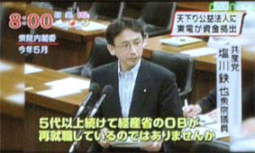 同番組は、原発推進の財団法人「電源地域振興センター」の理事長、社団法人「海外電力調査会」の専務理事が経産省OBの「指定席」となっていたことを明らかにした国会質問を詳しく紹介。「天下り法人に流れる東京電力の資金。一日も早い賠償を望む被災者にとって、この事実はどう映るのか」と提起。 司会のみのさんは「お金が足りないから電気料金をあげようじゃないかといっている。まずこっちをカットしなくちゃいけない」と強調。番組に出演した岸博幸慶応大学大学院教授が「民主党はこの2年間で結果的に官僚側に妥協してしまった」と官僚の天下りを放置している政権・与党を批判すると、番組コメンテーターからも「徹底的にメスをいれないとダメだ」との声があがった。 |