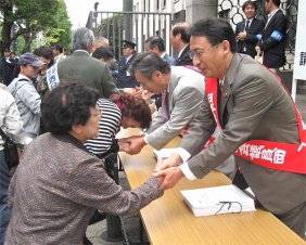 ■全国じん肺弁護団連絡会議の「なくせじん肺キャラバン国会請願デモ」(10月19日) じん肺とアスベスト被害の根絶のために国の責任を明確にすべき。多くの参加者と握手、握手。力のこもったその握手に、被害者、参加者の思いが込められている。 | |||||||||||||||||||||||||||||||||||||||