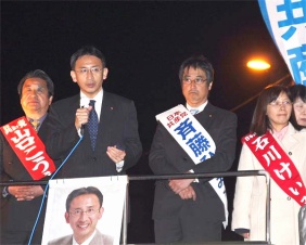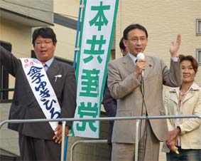 埼玉県の朝霞駅前で街頭演説。朝霞市は、全国トップクラスの財政力なのに、市民に冷たい。所得の減る市民に対し、国保税1万5千円の値上げだ。この負担増に保守、公明、民主の議員が賛成している。市政のチェック機能を果たせていない。 日本共産党は、国保税値上げについて、医療費の過大見積もりを追及。市長に「見込みに甘さがあった」と認めさせ、2千円の引下げを実現した。 いま話題の朝霞公務員宿舎建設問題でも、市民本位の跡地利用を主張。「宿舎より緑を」と訴え、中止を求める全議員要望書の取りまとめにも尽力してきた。 日本共産党の3議席の実現で、国保税2万円引下げ、保育所増設、中学卒業までの通院医療費無料化を実現しよう。 | ||||