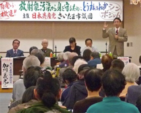 ■さいたま市/放射能汚染から身を守るシンポ(11月6日) 日本共産党さいたま市議団が主催した、「原発からの撤退」や放射汚染への対応をテーマにシンポジウムに参加。被爆医師の肥田舜太郎さん、埼玉自治体問題研究所の渡辺繁博事務局長、新日本婦人の会の大熊美奈子さんらと一緒にパネリストをつめた。民主党政権は、いまだに原発を推進しようとしている。原発撤退をはばむ「原発利益共同体」の癒着構造を断ち切るために国民の運動が必要。放射能の除染や被害賠償を国や東電、原発推進大企業に責任を取らせていたい。 |