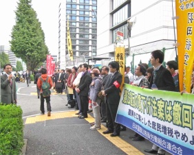 ■賃下げ法案は憲法違反/公務労働者の座り込みを激励(11月22日) 政府が国会提出している国家公務員の賃金を平均7・8%引き下げる特例法案(賃下げ法案)の国会審議が始まる緊迫した状況のもとで、全労連公務部会・公務労組連絡会が、賃下げ法案の廃案を求めて、衆院第2議員会館前で200人が座り込み行動。賃下げされれば、景気悪化をさらに深刻にし、賃下げの悪循環を招く。法案の撤回、廃案を求めていく。 |