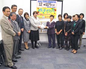 ■新婦人が“原発ゼロ”署名提出(11月14日) 新日本婦人の会(新婦人)が、原発ゼロや原発推進政策の抜本見直しを求める12万6229人の署名を国会に提出。赤嶺、笠井、高橋、宮本各衆院議員、田村参院議員らといっしょに署名を受け取り、参加者たちを激励した。署名は、▽原発からのすみやかな撤退で、原発ゼロへ▽東京電力福島第1原子力発電所の事故をふまえ、原発推進政策の抜本見直しと持続可能な自然エネルギーへの転換を求めます――の2種類。 新婦人で独自に作成し、全国で開かれている原発ゼロを求める集会や学習会、街頭宣伝などで集め、7月にも約2万人の署名を国会に提出しており、この日の分と合わせて15万5067人になった。 |