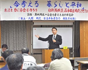■埼玉・入間市/「いま、考える暮らしと平和の集い」(11月19日) 埼玉県所沢市・入間市・飯能市・狭山市・日高市5市の平和委員会・原水協主催で「いま、考える暮らしと平和の集い」が入間市内で開かれ、参加した。12年前の狭山市内の自衛隊入間基地の航空機墜落事故を風化させず、周辺住民100万人のいのちと暮らしを守るとりくみとして、毎年11月に開催されている。 「集い」では、平山武久埼玉平和委員会理事が「入間基地周辺から考える住民の安全と平和」と題して講演し、「新防衛計画大綱」での自衛隊の変化について、「基盤的防衛力」から「動的防衛力」として、自衛隊が世界のどこにでも動ける体制づくりがすすんでいることを強調していた。 わたしは、TPPや選挙制度などとともに基地問題について、市民の要求でたたかいをひろげていくことと、基地機能強化の根底に安保条約があることを知らせていくことが大事であることを話した。 また、米軍所沢通信基地をめぐる動きについて荒川広所沢市議、「消防広域化」問題について石田芳入間市議、自衛隊入間基地の基地機能強化について飯島邦男党狭山市委員長が報告した。 | ||||