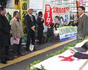 ■給与臨時特例法の廃案を/国会前行動を激励(11月10日) 全労連公務部会・公務労組連絡会がおこなった給与臨時特例法案のすみやかな廃案をもとめる国会前行動にかけつけ、あいさつ。国家公務員給与特例法案(賃下げ法案)撤回を求める集会。民主党の公務員人件費2割削減に道理なし。公務員賃金を下げれば、民間賃金も下がるという悪循環に陥る。600万人以上に影響を与える国家公務員の給与削減を行えば、デフレがいっそう加速する。年間3千億円の削減というが、それなら思いやり予算などの米軍関係経費年間3千億円こそ削減すべきだ。 | ||||