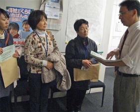 ■全労働省労働組合から「国家公務員給与の公平な水準確保をもとめる請願」(12月1日) 失業者が増大している被災地では、ハローワークが本当に忙しくなっている。復旧復興事業が始まり、建設土木の現場作業が増え始め、違法労働是正のための労働基準監督官の仕事も忙しい。必要な人員の増加こそ必要なのに、人は増やさず、賃金だけ下げる。これでは国公労働者の力を引き出せない。 | ||||