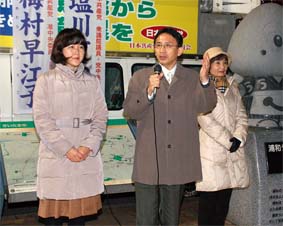 ■臨時国会閉会/JR浦和駅前で街頭宣伝(12月9日) 臨時国会が閉会し、柳下礼子県議や衆院北関東ブロック比例代表の梅村早江子さんと一緒に、さいたま市のJR浦和駅前で街頭宣伝。民主党政権の2年間が問われている。庶民増税や米軍基地のたらい回し、TPP、原発推進など自公政権との違いがなくなっている。アメリカ・財界いいなりという政治のゆがみの大本をたださなければ政治は変わらない。日本共産党を伸ばして、今度こそ政治の転換を実現しよう。 |
