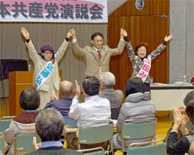 栃木県上三川町で町議選・国政選挙躍進をめざした演説会。原発推進や環太平洋連携協定(TPP)参加をめぐる問題では、民主党や自・公両党で政策的に違いがない。日本の政治を変えるため、「オール与党」に対決する日本共産党の躍進が欠かせない。そのためにも、いなば町議を必ず市政に送ってほしい。 | ||||