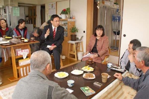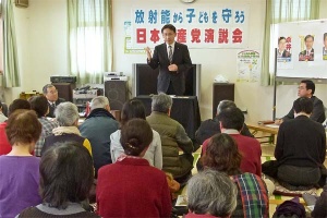 ■栃木・佐野市/福島の原発事故避難者と懇談(3月4日) 佐野市内の雇用促進住宅に南相馬市から避難してきた被災者にお会いしてお話をうかがった。この雇用促進住宅には24世帯78人が避難している。「4月から区域変更が行われて“帰れる”といわれても、ライフラインもないし、近くには汚染土壌の仮置き場もできるというのでは、住むことができない」「仮設住宅もどんどん造っているが、事故収束もしていないのに大丈夫か」「雇用促進住宅に入れたのは良かったが、エアコンも給湯器も自費で設置した」「東電は事故の責任を感じていない。ただ頭を下げるだけ。賠償も勝手に削るようなことを考えている。避難解除で賠償打ち切りになるのでは。生活が成り立たないのは変わらないのに」。 避難生活が続く中での不安は大きい。 | ||||