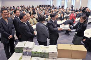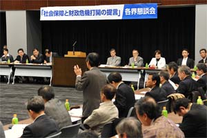日本共産党の「社会保障と財政危機打開の提言」で各界懇談会を国会内で開催。労働、中小企業、医療・社会保障、農漁業、女性、芸術・文化など各分野から71団体、経済、社会保障の研究者を含め110人が参加して、活発に意見交換。各界の意見を聞いた。 |