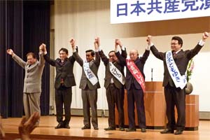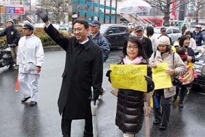 ■埼玉/坂戸市で演説会(3月24日) 埼玉県坂戸市議選(4月8日告示・15日投票)の勝利と総選挙での前進をめざした演説会。衆院埼玉10区の梅沢永治さんとともに訴えた。内需主導の経済成長で国民所得を増やしながら社会保障の充実と財政危機の打開をすすめる党の「提言」の内容を紹介。消費税に頼らない社会保障充実の明るい展望を示せるのが党の『提言』。 また、党坂戸市議団は、中学卒業までの子ども医療費無料化や国民健康保険税1人1000円の引き下げ、住宅リフォーム助成制度の復活など市民と力を合わせて実現してきた。高すざる上下水道料金の引き下げ、国保税のさらなる引き下げ、放射能対策の強化など市民の暮らしを守る政策をかかげている。 総選挙での日本共産党の前進と坂戸市議選での勝利を。、 |
