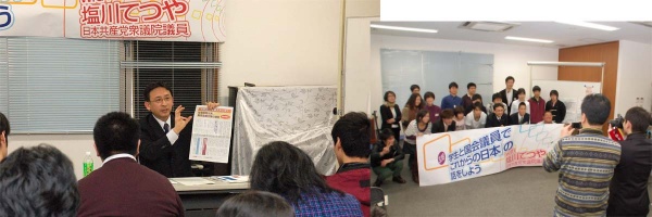 ■埼玉/学生とのトーク集会(3月18日)![]() 埼玉県内の学生でつくる実行委員会によるトーク企画「学生と国会議員で『これからの日本』の話をしよう」がおこなわれ参加。 「就職できないのは自己責任ではないか」「どうして国の借金がこんなに増えたのか」など学生の率直な疑問・質問から、「おもしろい国会議員は誰か」「言い争って本当のけんかになることはないのか」などたくさんの質問が出された。 かつてない異常な就職難――それをつくり出した政治、経済の状況こそ問われなければならない。この10年あまり続いた新卒正規採用の抑制と非正規労働者への置き換えなど短期的利益を求める大企業の身勝手な行動や、労動分野の規制緩和を進めてきた政治の実態がある。 国の借金――財政危機の原因が大型公共事業と大企業・大資産家への減税を繰り返してきた経済対策にある。消費税増税に頼らず社会保障の拡充と財政再建をめざす日本共産党の「提言」を紹介した。 また、岩手県出身の学生からは「復興への政府の対応はすべてが後手。政策の優先順位をきちんと見直してほしい」と発言があった。――被災者の暮らしの再建が第一だ。それなしには地域の復興はない。